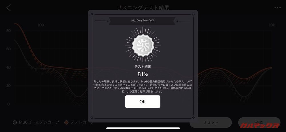 ▼テストが完了すると自分の聴力に合わせてMu6の性能を最大限発揮するチューニングを自動で行ってくれます。なおテストは複数回行うと更に精度が向上するとのことで何度かテストすることをオススメします。↓