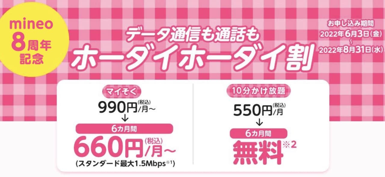 ▼mineoでは「マイそく」のライトコースと合わせてmineoの8周年を記念した2つの新キャンペーンも発表してます!↓