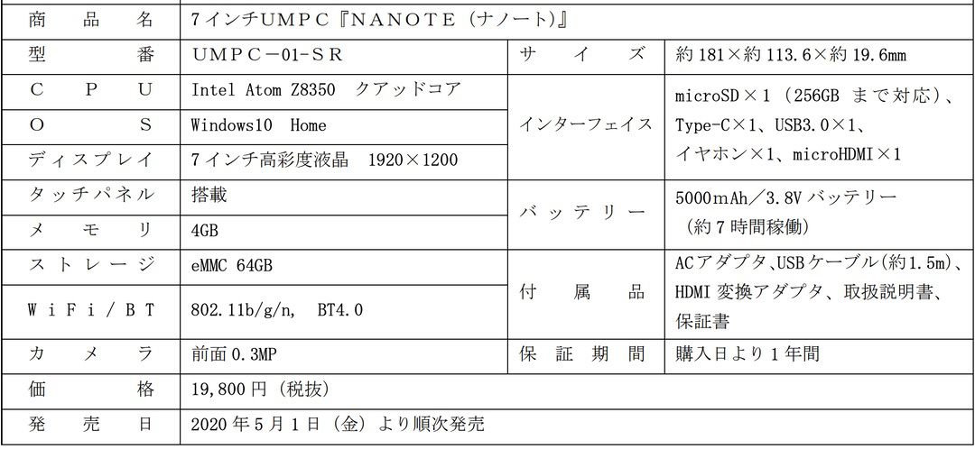 なんと、7型のウルトラモバイルパソコン(UMPC)「NANOTE(ナノート)」をリリースするんですって!価格19,800円なんですって!性能はお察しなんですって!こういうの大好物。購入決定ですよ。