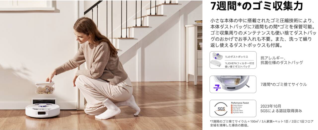 ▼ロボット掃除機内のダストバッグに入ったゴミは空気の力で圧縮され、なんと約7週間のゴミを収集できるようになってるんです。なのでこんなにステーションがコンパクト!↓