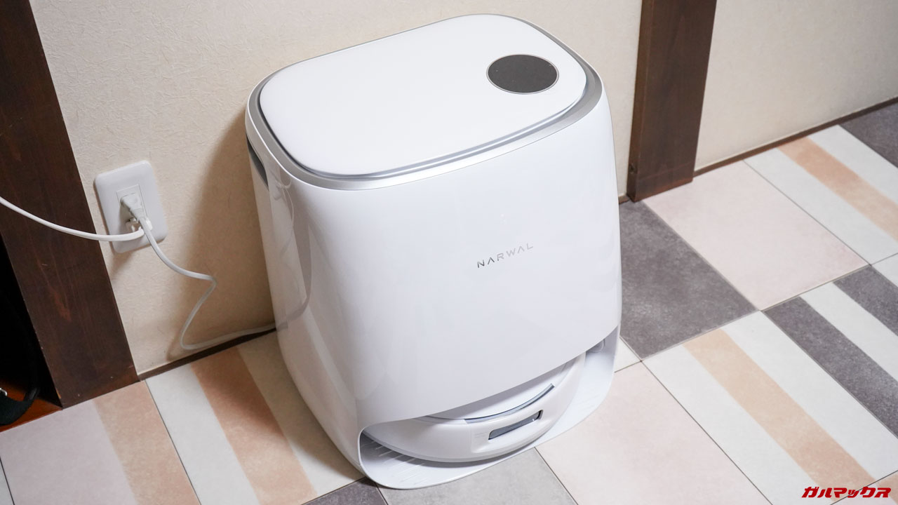 上の写真をみてもらうと分かる通り、ステーションがめちゃくちゃコンパクトじゃないですか。ゴミ収集機能は無いのかな?って思われそうですが、Narwalの最新ゴミ処理技術が”ロボット掃除機本体”に組み込まれてます。