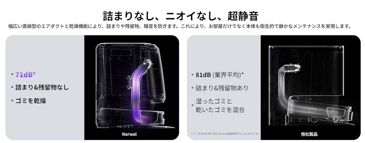 ▼あとですねステーションにゴミ収集するタイプではなくて独自の自己完結型ごみ処理技術を採用しているので、掃除後のゴミ収集時に発する爆音の吸引音がしないのもGoodポイント。↓