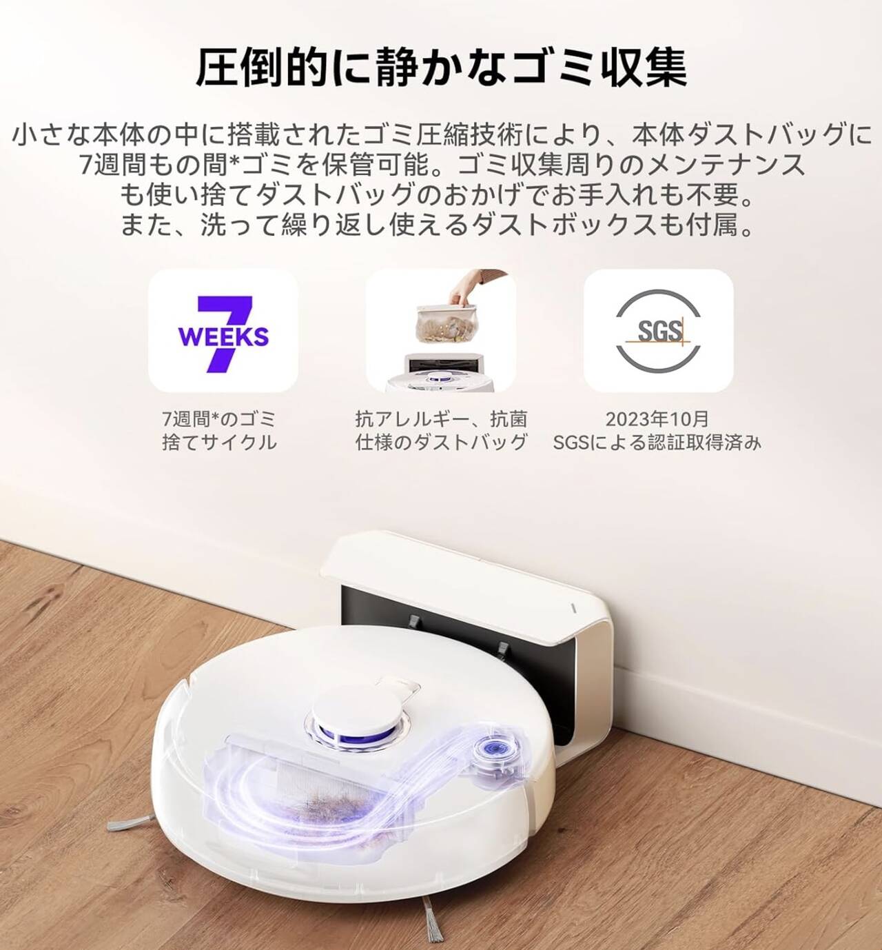 ▼ステーションがめちゃくちゃコンパクトなのでゴミ収集機能はないのか・・・と思った方、ご安心を。本体には独自のゴミ圧縮技術を採用したダストバッグを搭載!なんと7週間ほどゴミを溜められるように設計されてます。↓