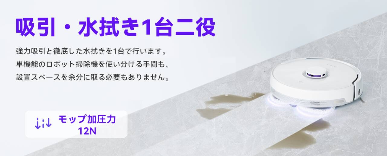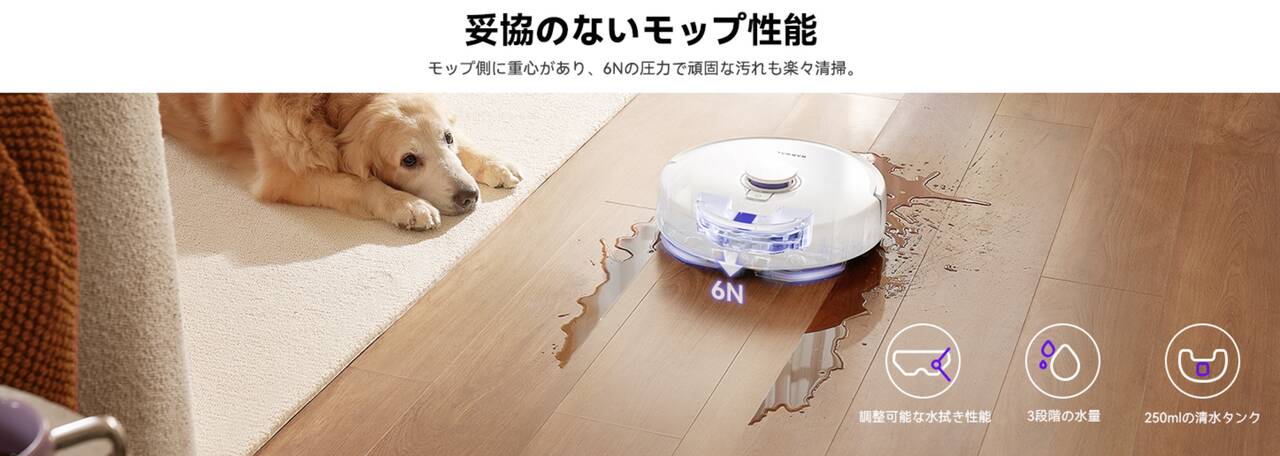 ▼水拭きは6Nの圧力で押し付けて拭き上げてくれる加圧式ってのもポイント高いですね〜。ただ上位モデルのように自動で水タンクを補充するタイプじゃないので、拭き掃除は気になったタイミングでするという人に合ってるタイプ。↓