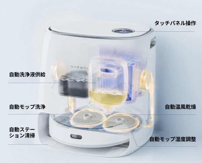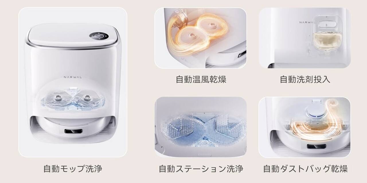 ▼もちろん完全自動タイプ。水タンクへの補充、洗浄液投入、モップ自動洗浄、モップ乾燥、なんならステーション自体も洗浄してくれるので、レベルの高い「ほったらかし運用」ができちゃいます。↓