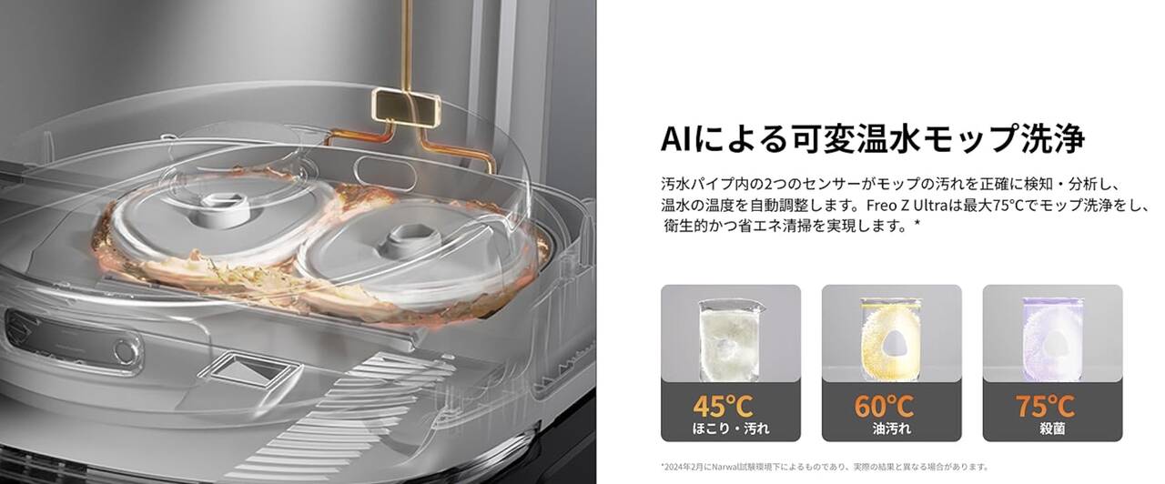 ▼ちなみにAIはあらゆるシーンで活用されてるんです。例えばモップ洗浄などもAIが汚れ具合を分析できるようになったので汚れ具合によって水温を調整する可変温水モップ洗浄にも対応しました。↓