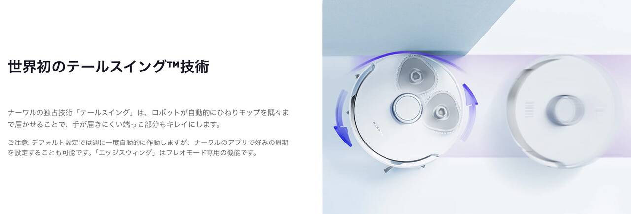 ▼モップは12Nの加圧式回転モップを搭載!テールスイングも当時は世界初搭載されたのが話題になってましたねぇ。これも今では標準的な機能になりました。今もですが当時もNarwalは最先端を突っ走ってました。↓