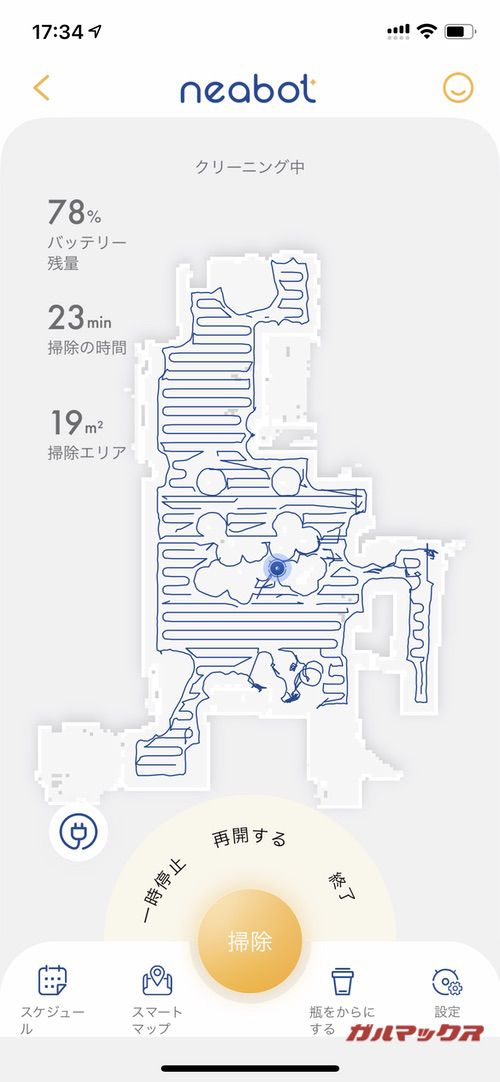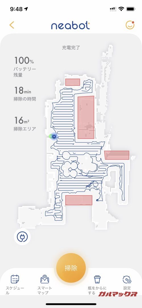 こんな感じですね。あと、進入禁止エリアに設定している部分は掃除出来ていないところなので、自身で仕上げの掃除はしてやりましょう。