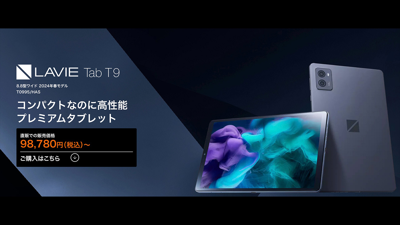 NEC LAVIE Tab T9の価格はNEC Directだとメモリ8GB+容量128GBが98,780円、メモリ12GB+容量256GBが109,780円だ。