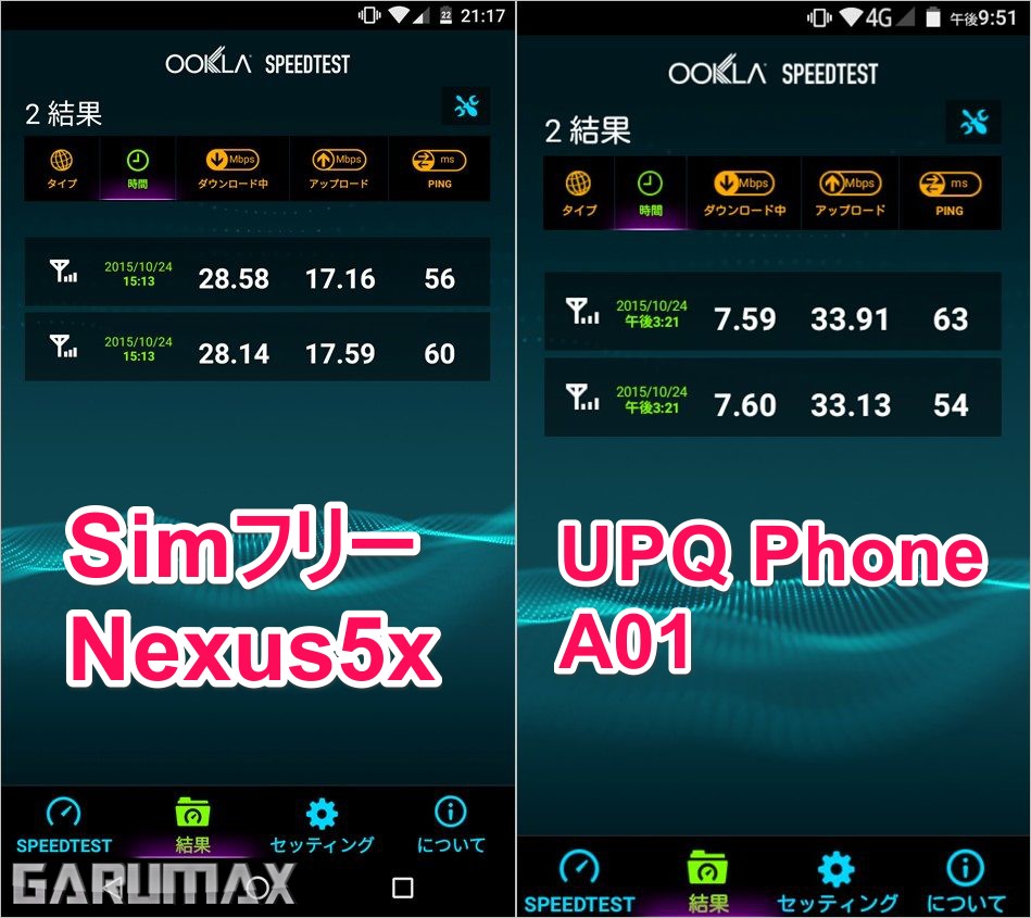 ↓同一Simを差し替えて速度測定しているので時間差はありますが、それでもこれだけ実測値に差がある。