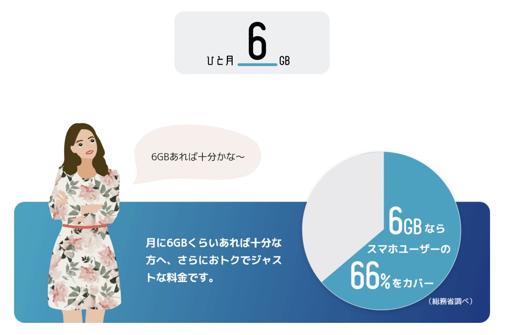 ▼データ容量は6GB付き。日本通信曰く、スマホユーザーの66%をカバー出来る容量とのこと。確かに自宅でWi-Fi繋いでいる方は6GBくらいで足りそう。↓