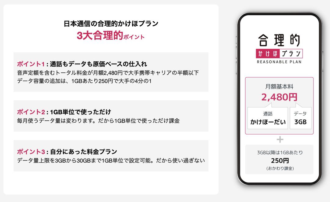 日本通信の合理的かけほプラン詳細まとめ。通話かけ放題とデータ3GB付きで月額2,728円