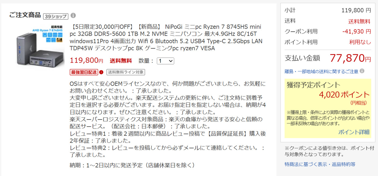 特に今回は楽天での開催ですので、ユーザーさんによってはポイント還元などで実質価格がもっとお安くなる可能性もあります。ハイスペックなミニPCをお探しの方は是非とも検討してみてはいかがでしょうか!