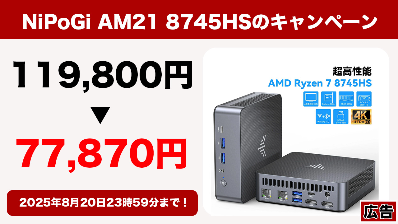 8月20日まで!ミニPC「NiPoGi AM21 8745HS」が77,870円で購入できるぞ!