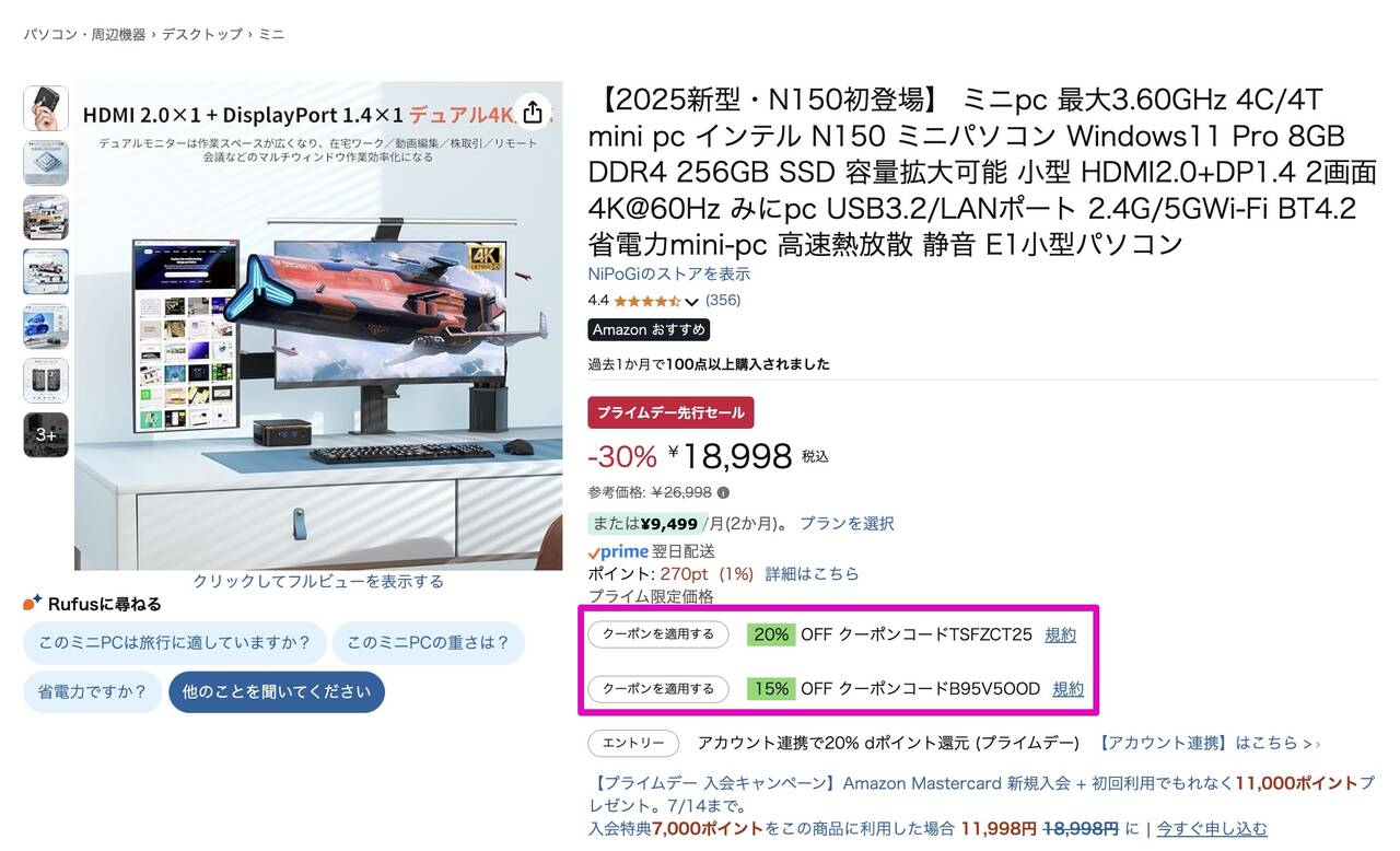 NiPoGi E1 N150モデルの通常価格は2.5万円とそのままでも十分ライバルと張り合えるレベルなんですが、7/8から開始されるセール時に発行されるクーポンコード「9SUZXLEC」を適用すると最終価格は13,299円とメチャクチャ安くなるんです。