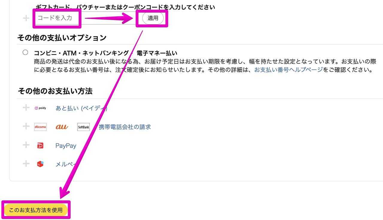 ▼レジ画面に「ギフトカード、商品券、プロモーションコードを使用する」というリンクがあるのでクリックして割引コード「9SUZXLEC」を適用して下さい。↓