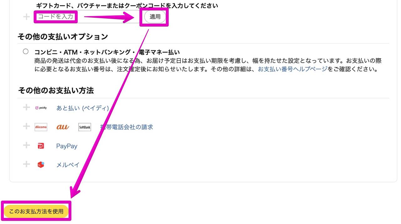 ▼レジ画面に「ギフトカード、商品券、プロモーションコードを使用する」というリンクがあるのでクリック。クーポン「YW85ZTJC」を入力して「適用」、最後に「このお支払い方法を使用」をクリック。↓