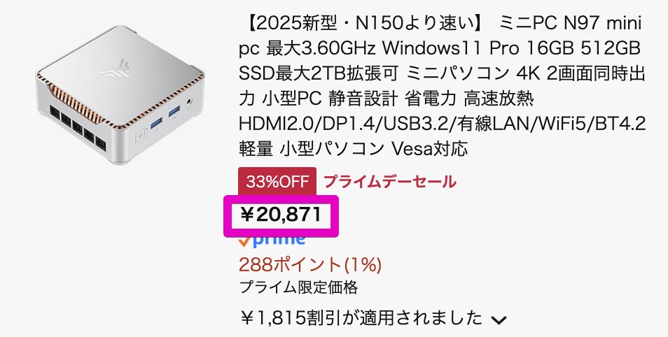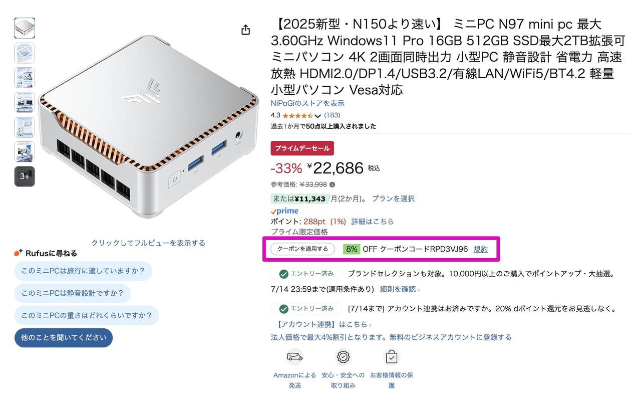 NiPoGi E2 N97モデルの通常価格は33,998円ですが、プライムデー期間中にクーポンコード「YW85ZTJC」を適用すると20,417円まで値引きされちゃいます!