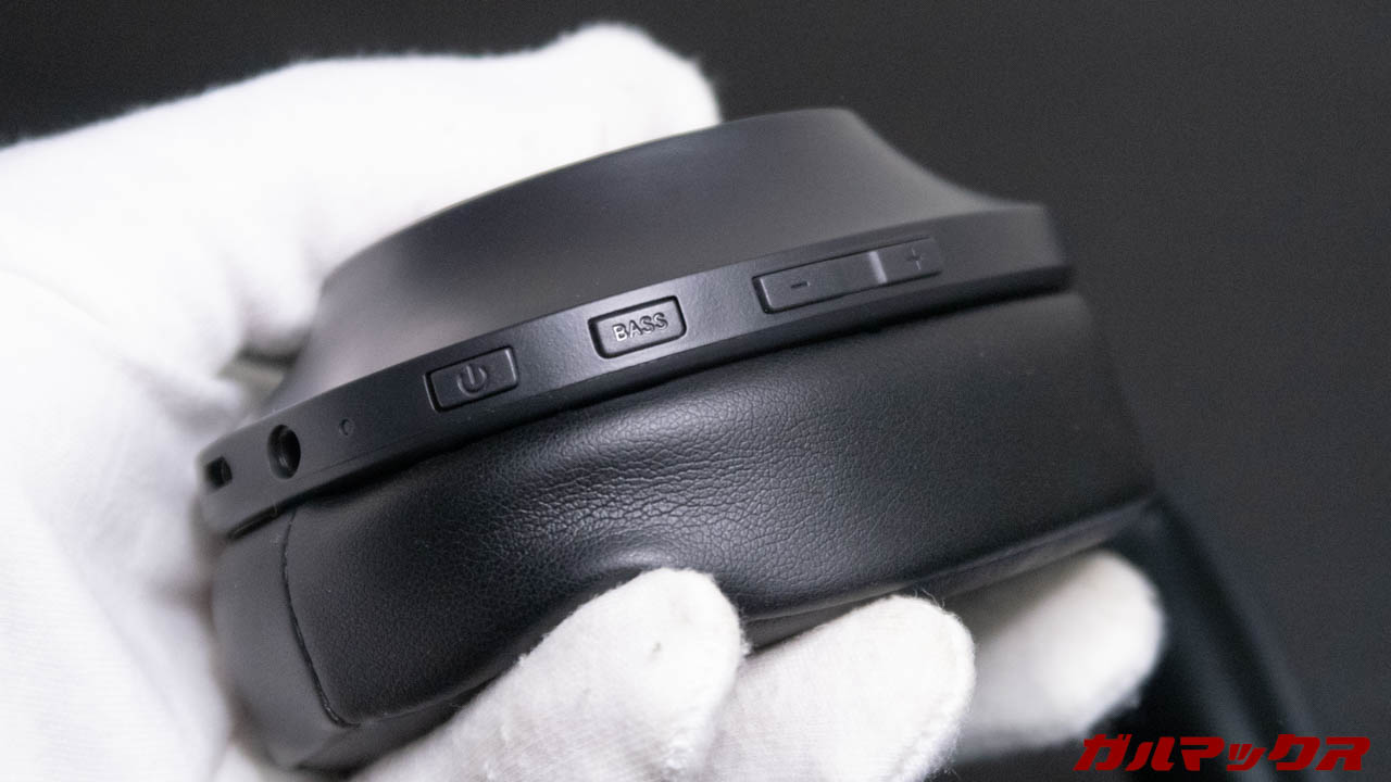 ▼ボタン、ポート類は左耳側に配置。LEDインジゲーターも赤、青に光り、起動中は青ランプが3回周期で点滅するので電源が入っているのがわかりやすいのもGood!↓