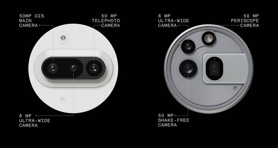 ▼リアカメラは50MP+8MP+50MPのトリプルカメラ構成。(3a)が光学2倍+ウルトラズーム30倍、(3a) Proが光学3倍ペリスコープ望遠+ウルトラズーム60倍に対応。↓
