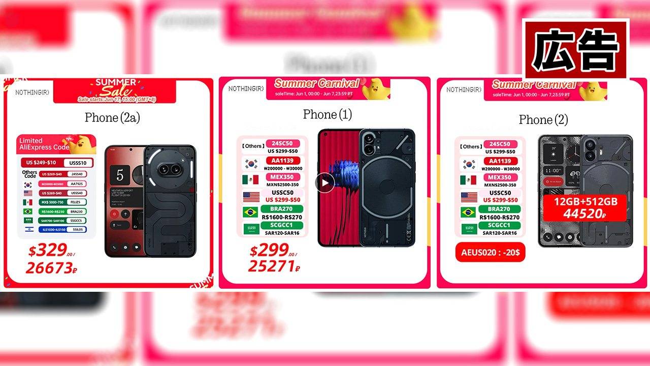 Nothing Phone (1)(2)(2a)がAliExpressでセール!Nothing Earシリーズも安くなるぞ!