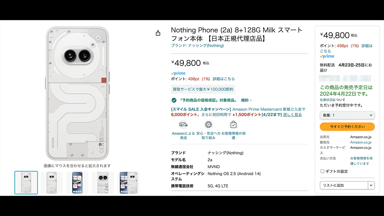 Nothing Phone (2a)の8GB版が予約開始!価格は49,800円で4月22日以降出荷!