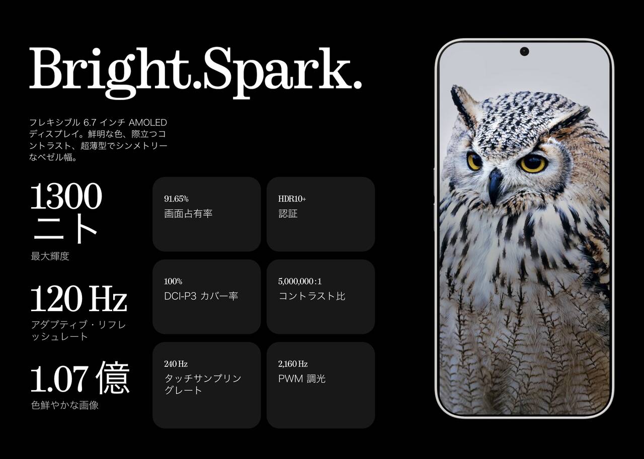 最近ディスプレイのアピールで多い最大輝度は1300nit。Nothing Phone (2a)は偉いな。ちゃんと屋外輝度(1100nit)と通常輝度(700nit)もスペック表に記載している。