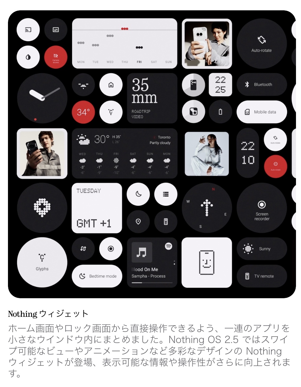 ▼ウィジェットもNothingらしいデザイン。ハードとソフトの統一感はほかでは中々味わえない水準に達している。↓