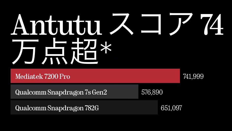 最新のミドルハイだとPOCO X6 Proみたいに130万点オーバーいっちゃいますって時代だからミドル枠だと超絶性能、ミドルハイ枠だと下っ端みたいな感じか。まあ普通に使う分には全く困る性能では無いし、国内モデルで最安構成49,800円ってのはかなりのコスパでインパクトある価格だと思う。