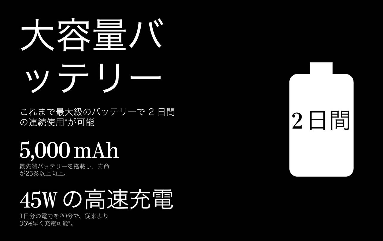 大容量になると充電時間が長くなるけれど45Wの急速充電にも対応した。最近は120Wの神ジューデンなんかも出てきてるけれど、ほとんどの人は45Wクラスでまず困らんレベル。