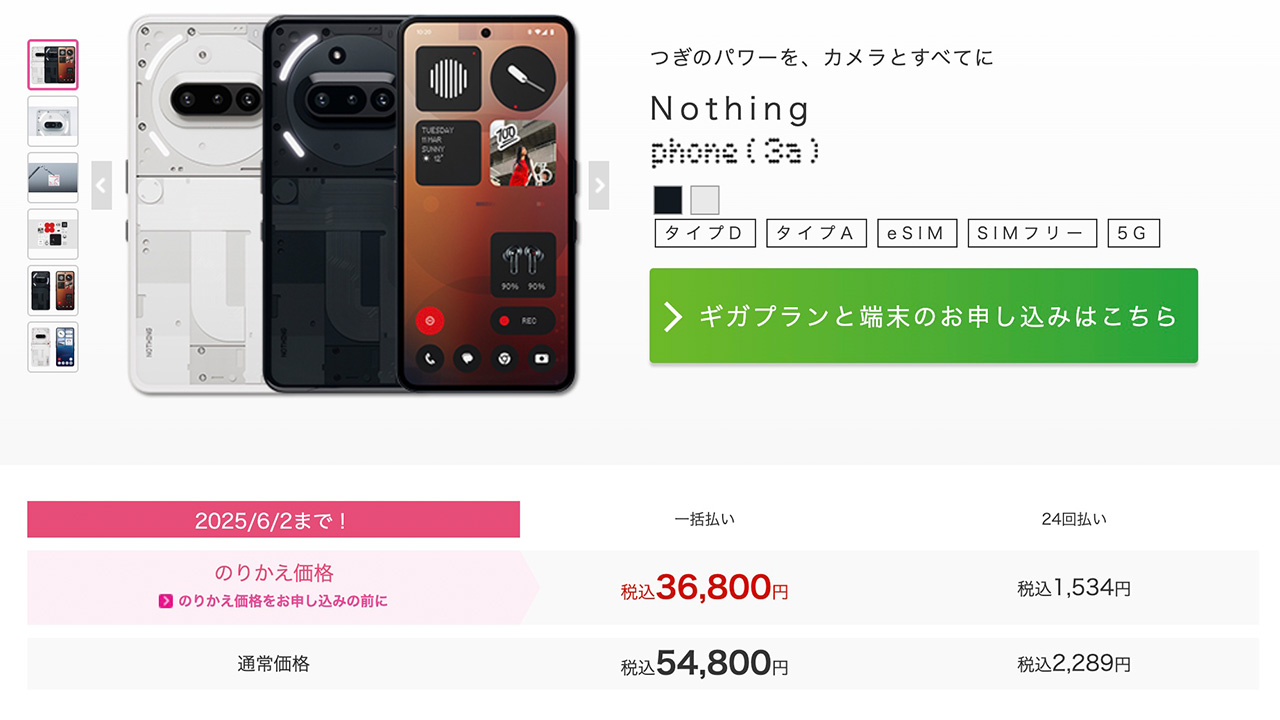 2025年4月15日に発売したばかりのNothing Phone (3a)が早くもIIJmioに登場!通常価格は54,800円、のりかえ価格は36,800円とお値打ち価格で打ち出されています。