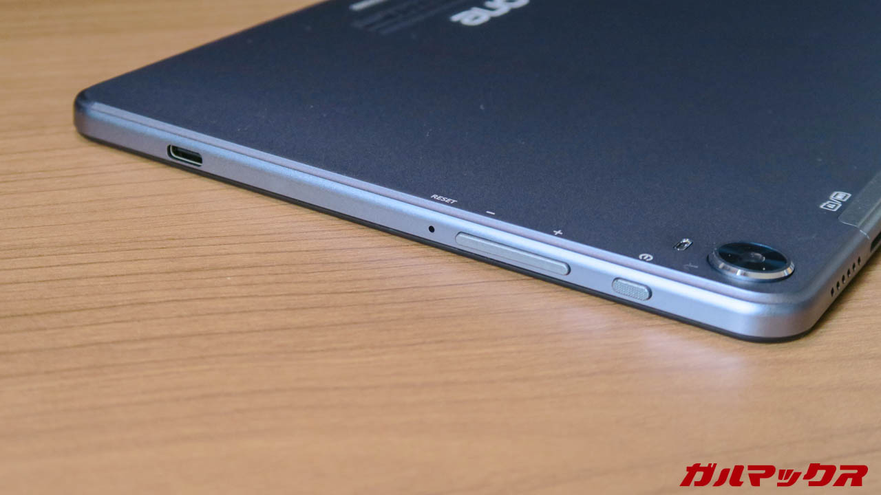 ▼インカメラのあるベゼルを上にした状態で、左側面のデザイン。充電用のType-C端子、音量キーと電源キーが配置されています。↓