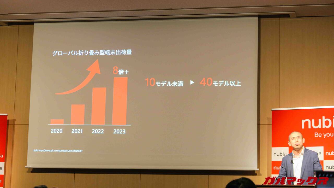 ▼というのも、商品企画本部の本部長であるPeter Deng氏によれば、グローバルにおける折りたたみ端末の出荷数は3年間で8倍と大きく飛躍しているんだそうで。↓