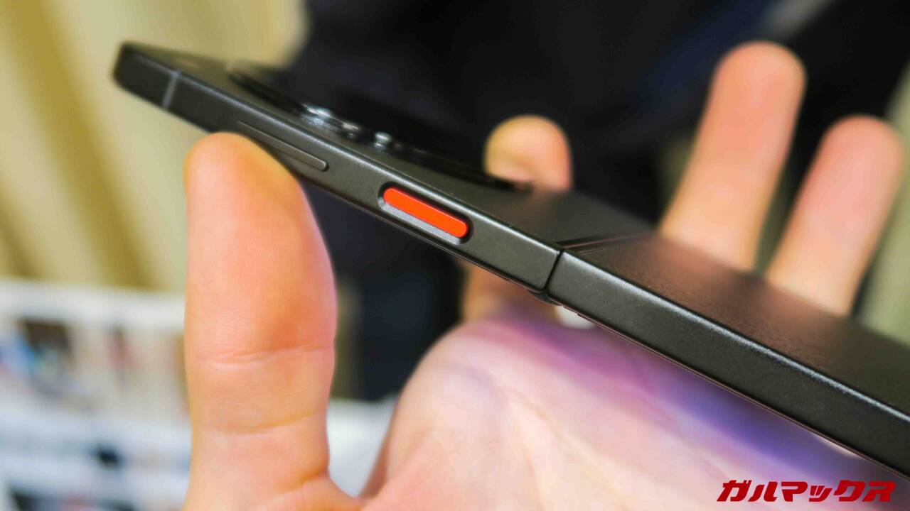 ▼さらに、指紋センサー内蔵兼電源キーは赤いアクセントが入っているのがクッソカッケェ!nubiaってZ60 Ultraもそうなんだけど、黒に赤色のアクセントっていうイメージがあってかっこいいのなんの。↓
