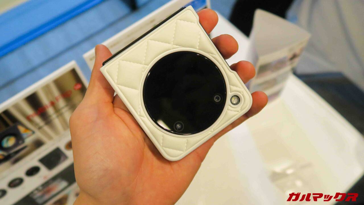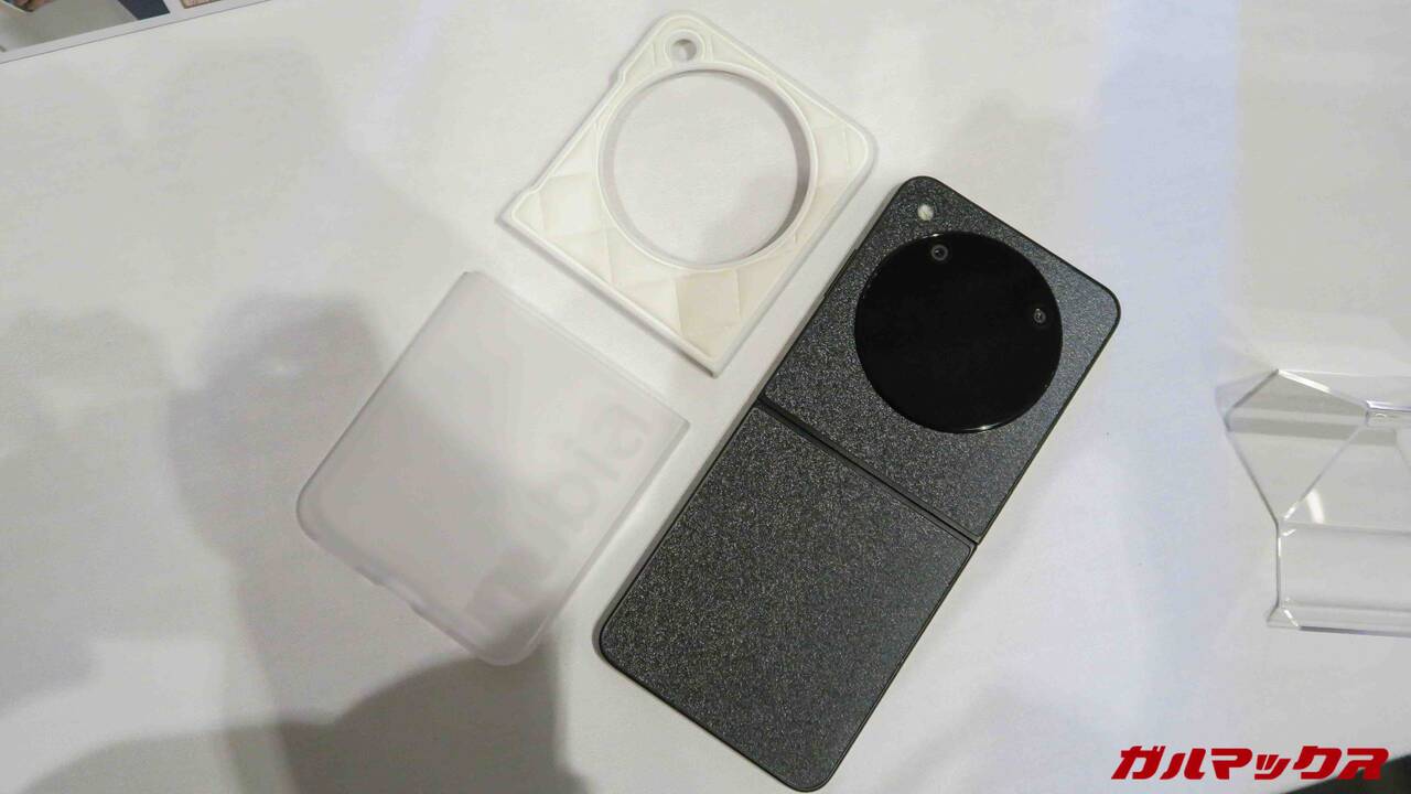 ▼これはオマケですが、nubia Flip 5Gの専用ケースも会場に用意されていました。こちらは表面がハンドバッグみたくモフモフな感じ。デカいnubiaロゴも目立ちます。↓