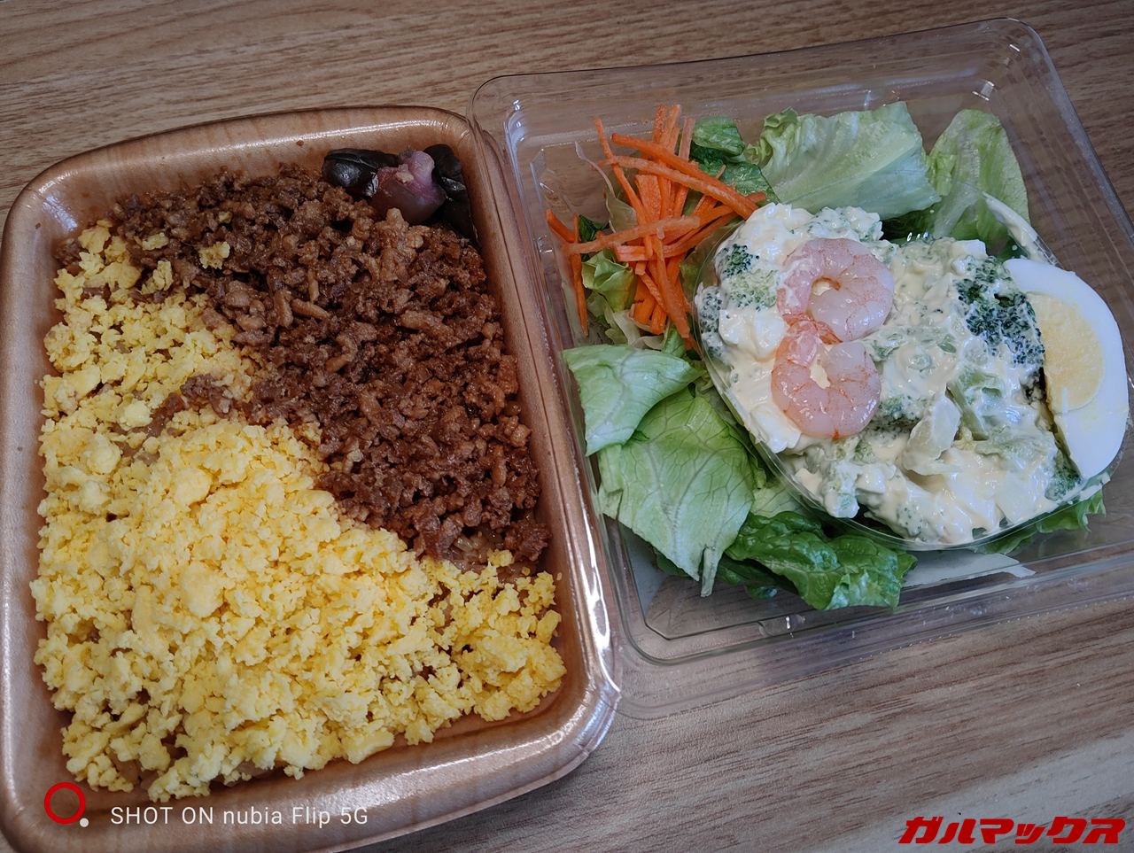 ▼またメシ撮りもやや暗めでした。左のそぼろ弁当はまだしも、右のサラダはもう少し鮮やかに明るく撮ってほしかったところ。↓