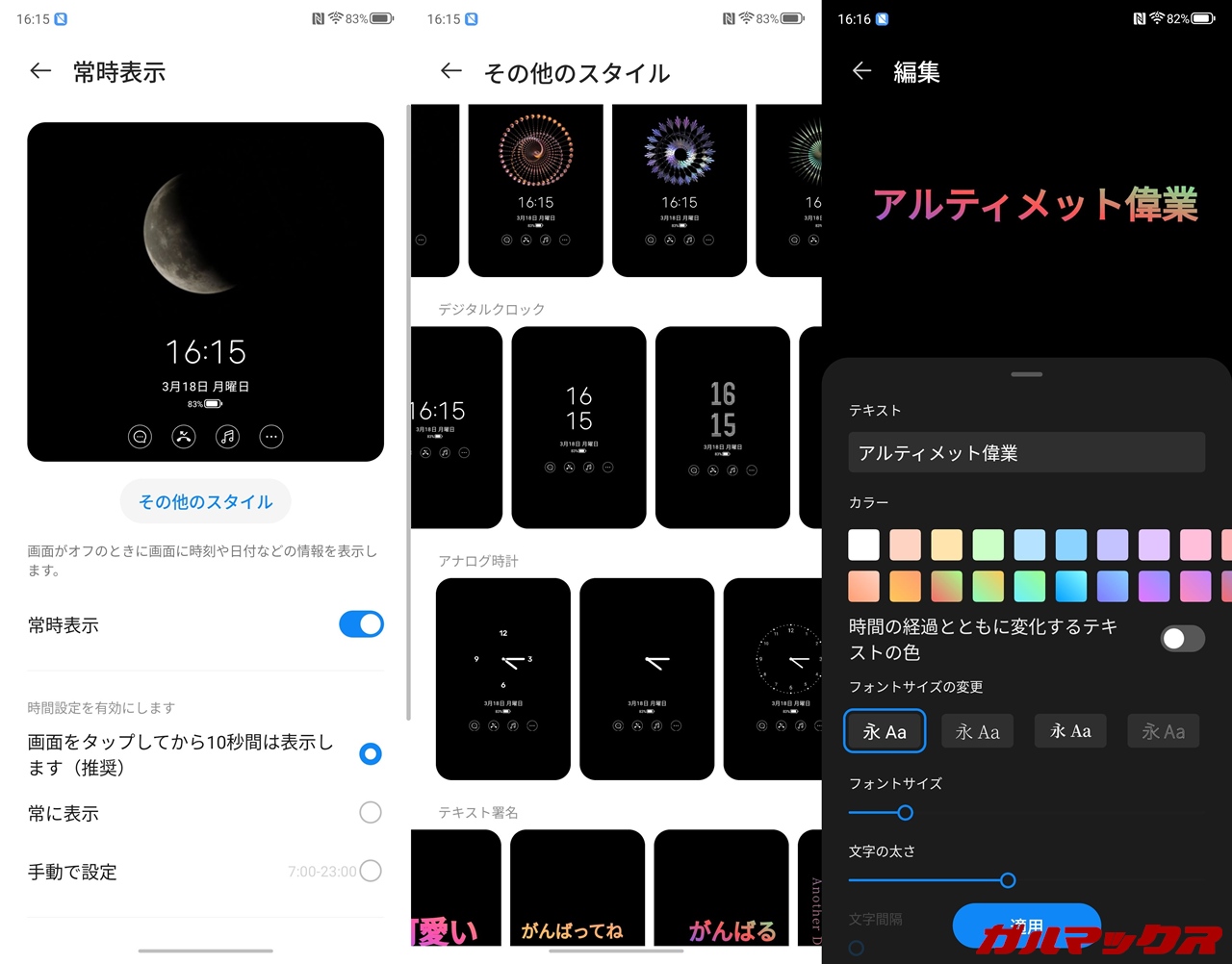 ▼AoDは常時表示、スケジュール表示、タップ後表示の3つの選択が可能。時計やデザインの変更も可能で、結構いじれて楽しいぞ!↓