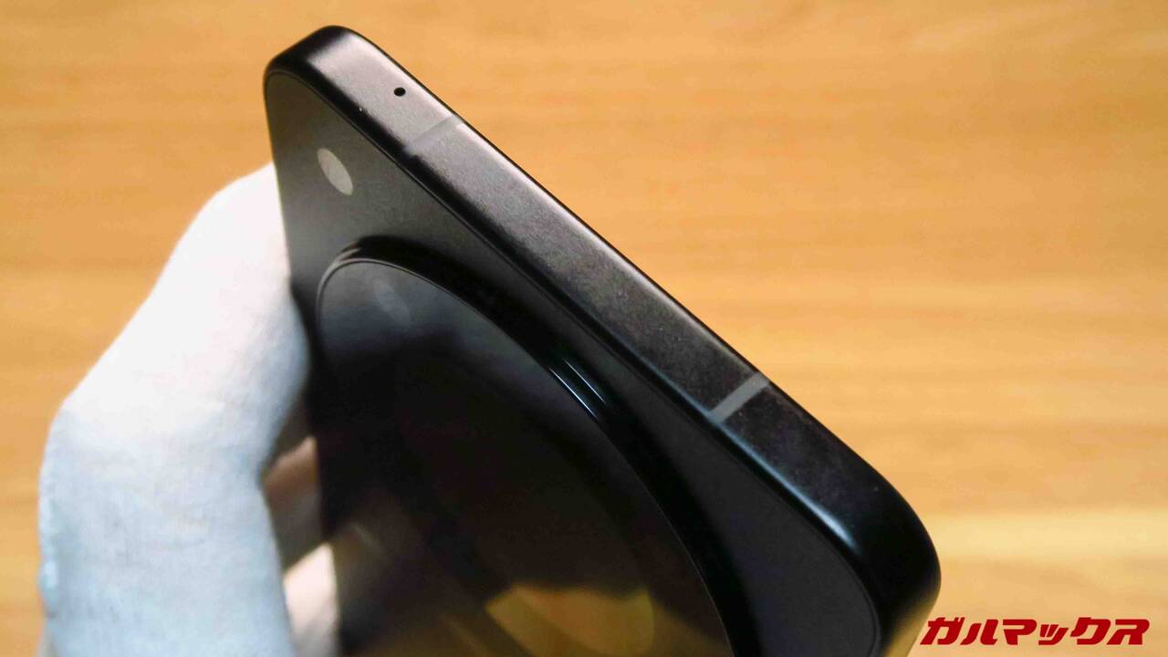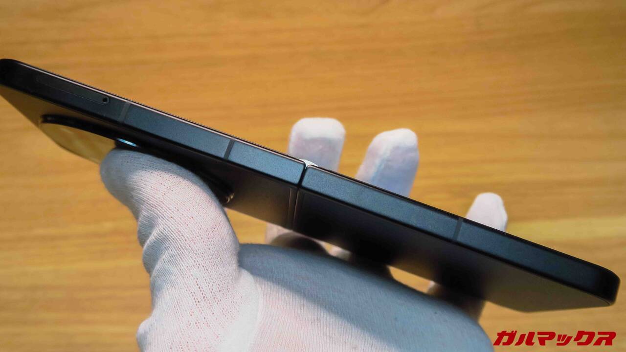 ▼周辺ベゼルは本体同色でマット調になっているのも特徴ですね。画面から出っ張っているのも、折りたたみスマホならでは。ただし完全に均一な幅というわけではなく、わずかに上下部のベゼルは厚くなっています。↓