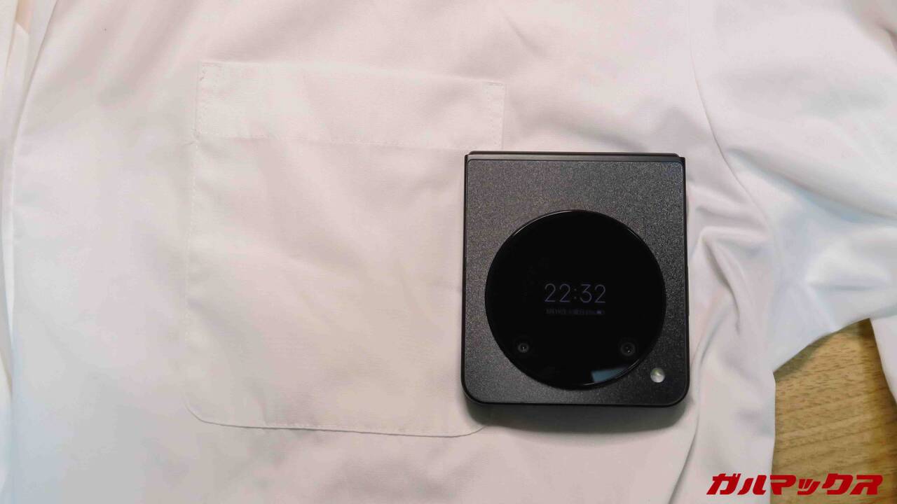 ▼それはさておき。筆者が4年前に触ったGalaxy Z Flipもそうだったんだけど、この小ささはかなり良い!ポケットに入れるときと、狭い机の上に置くとき。地味ながらありがたすぎる。ワイシャツの胸ポケにもスポッと入ってくれます。↓