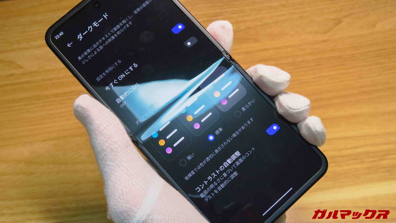 ▼折りたたみスマホの宿命としては中央部分に折れ目こそ出てきます。ダークモードだと反射でやや目立つけど、ライトモードでは目立たないですね。↓