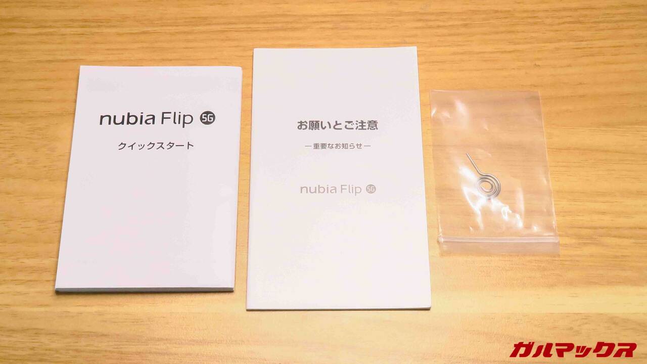 ▼nubia Flip 5Gの付属品はこんな感じ!なんと、超・最低限。充電ケーブルもついておりませんでした。↓