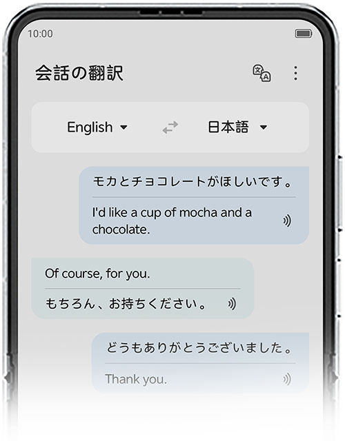 ▼通話時に言語を選択することで、AIが会話をリアルタイム通訳してくれる。LINEなどのアプリの通話にも対応。さらに、通訳内容を自動文字起こししてくれます。↓