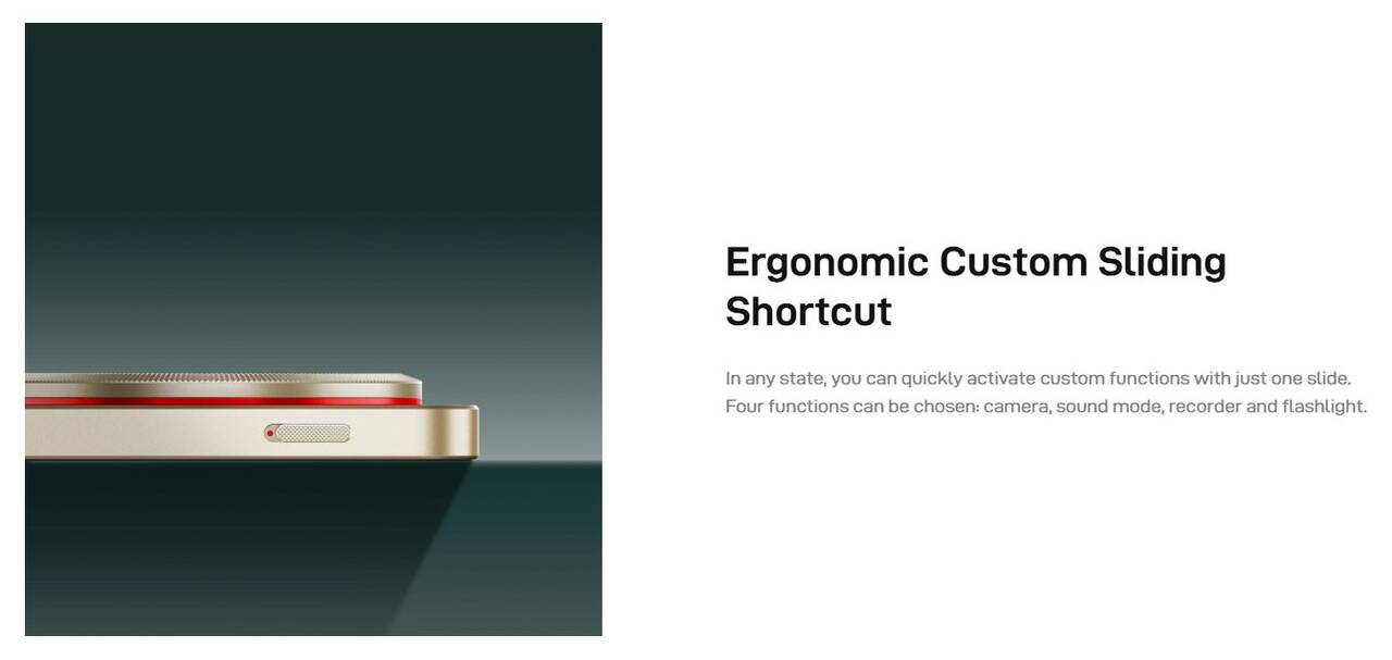 ▼カメラ以外にも特殊な機能としてはスライダースイッチを独自に搭載しているのが特徴です。カメラ、サウンドモード、録音、フラッシュライトの4つの機能を設定できるとのこと!↓