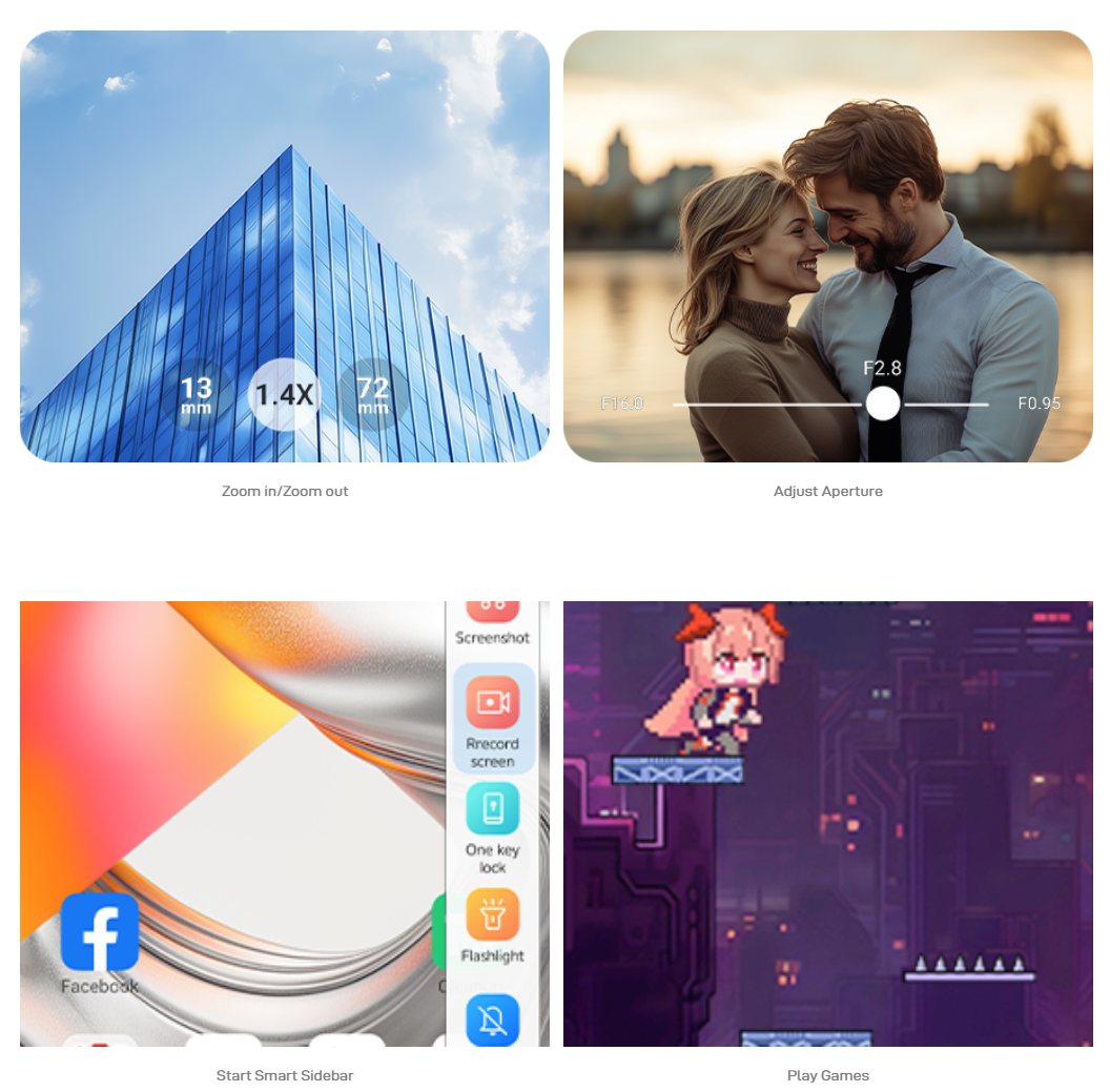 ▼もちろん本物なのでズーム倍率の調節からポートレート撮影におけるF値(背景ボケの強さ)の調節も可能!またデフォランチャーではスマートサイドバーの呼び出しができたり、ゲームの操作もできるみたい!↓