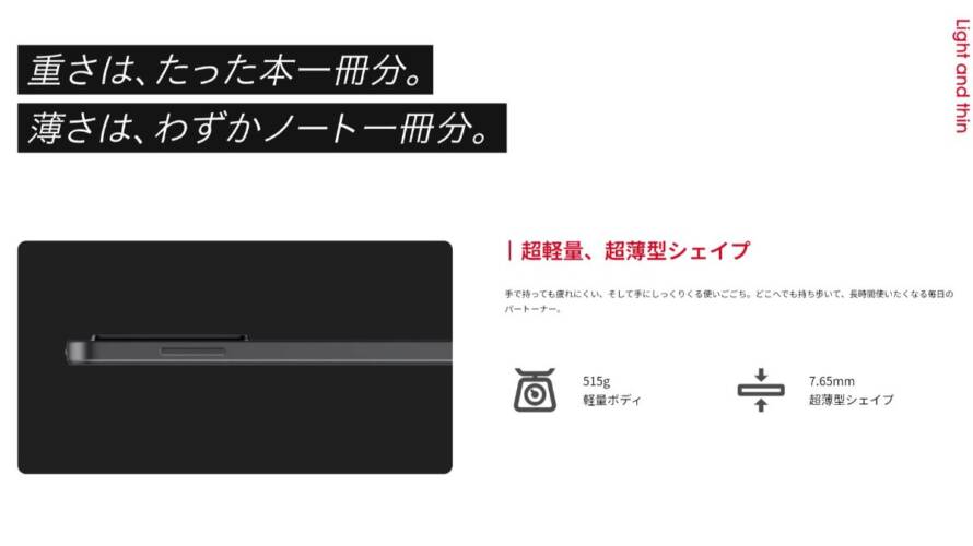 ▼515gの超軽量ボディと7.65mmの薄型ボディ!nubiaいわく、ノート1冊分とのことで持ち運びも苦にならなさそうですね。