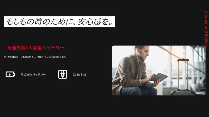 ▼nubia Pad SEは7,510mAhの大容量バッテリー搭載!厚さ7.65mmであることを考えると中々の容量です。なお充電は22.5Wに対応しています!↓