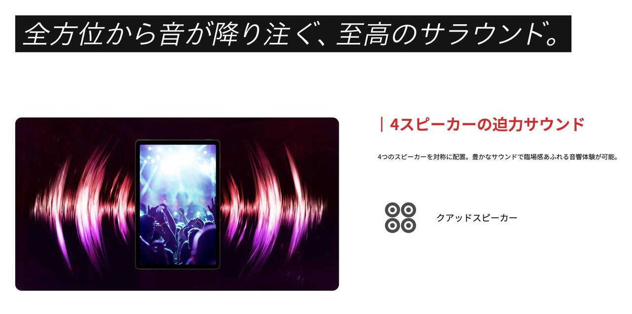 ▼タブレットではデュアルスピーカーを搭載しているモデルが一般的ですが、nubia Pad SEは5つのスピーカーを搭載!↓