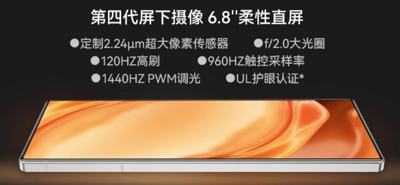ディスプレイサイズは6.8型で解像度は2480 × 1116。パネルはAMOLEDを採用しており120Hzのリフレッシュレートに対応します。ノッチレス形状でインカメラはディスプレイの下に埋め込まれているタイプを採用。ノッチレス形像と超狭額ベゼルにより没入感の高い映像体験ができるとしています。