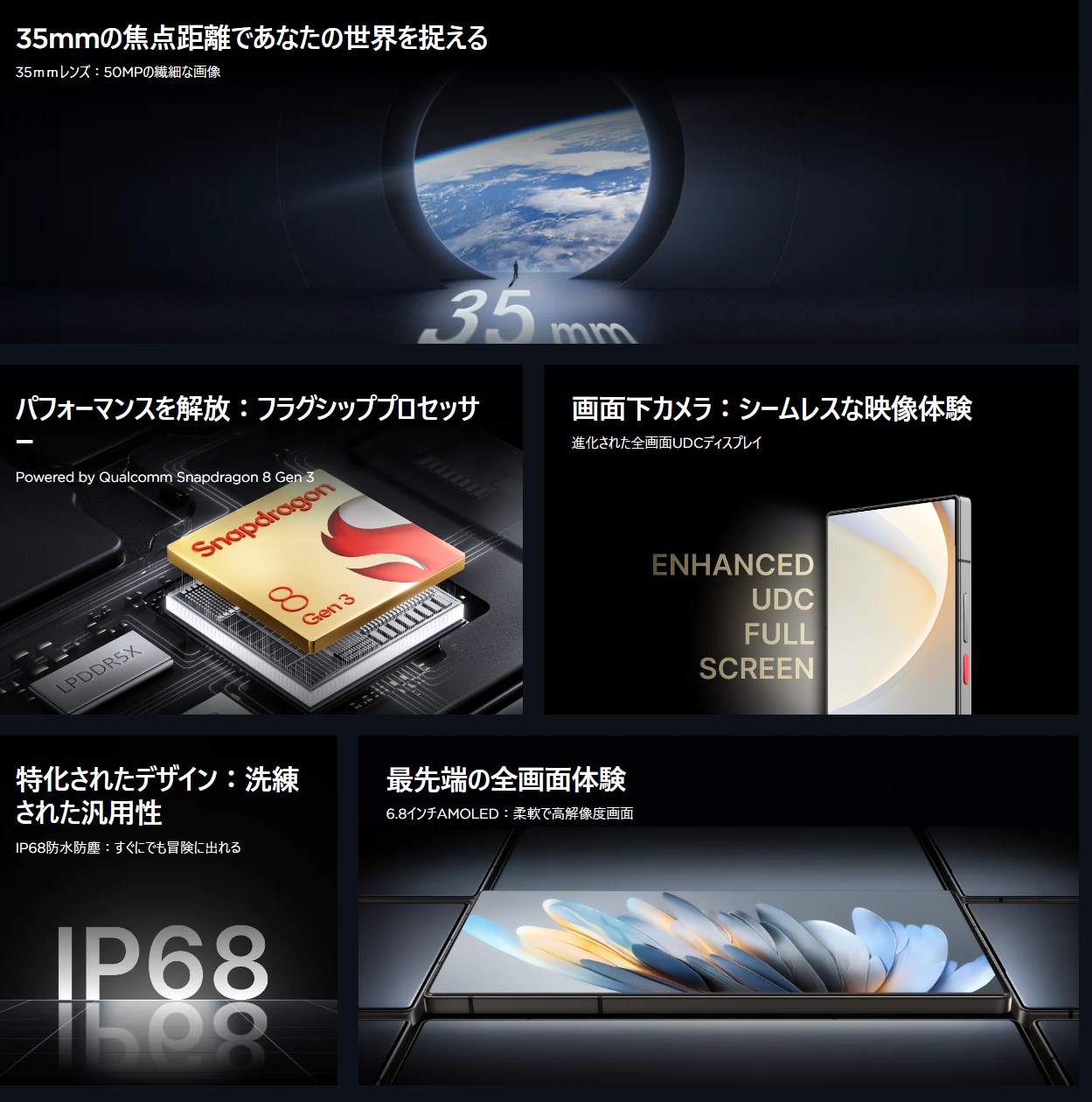 搭載するSoCは現時点で最新の最上位SoCとなるSnapdragon 8 Gen 3!ディスプレイは6.8型の有機ELで画面内蔵インカメラを搭載!筐体は最高等級となるIP68の防水防塵仕様!さらにカメラは5,000万画素の35mmカメラを搭載!