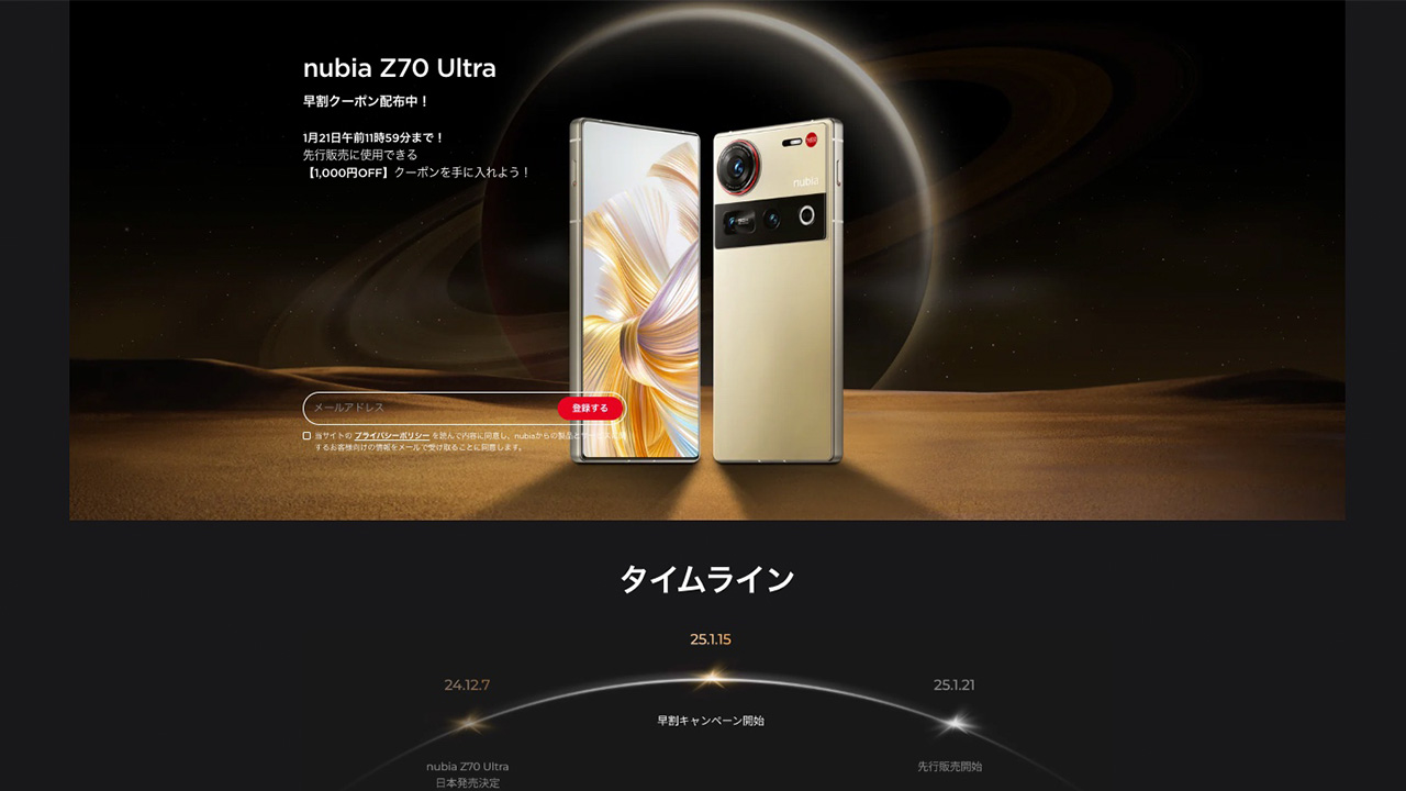 nubiaのカメラフォン最新モデル「nubia Z70 Ultra」が日本に正式上陸することはお伝えしていたんですが、先行販売の期間などが公開されました!この先行販売期間で使えるクーポンも配布が始まっているようです!